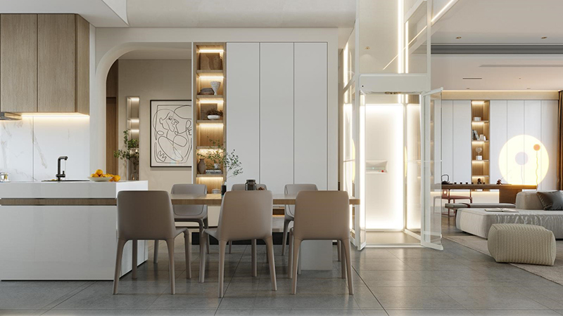 螺杆电梯因其自带玻璃观光井道,不需要预挖底坑可平地安装。区别于传统曳引电梯,有轿厢有对重占用相当大的空间。Housty亨世达螺杆电梯最小型号仅预留尺寸935mm×1011mm即可安装,平台可使用尺寸达到600mm×835mm,载重250Kg,空间使用率高,相当节省家庭空间。