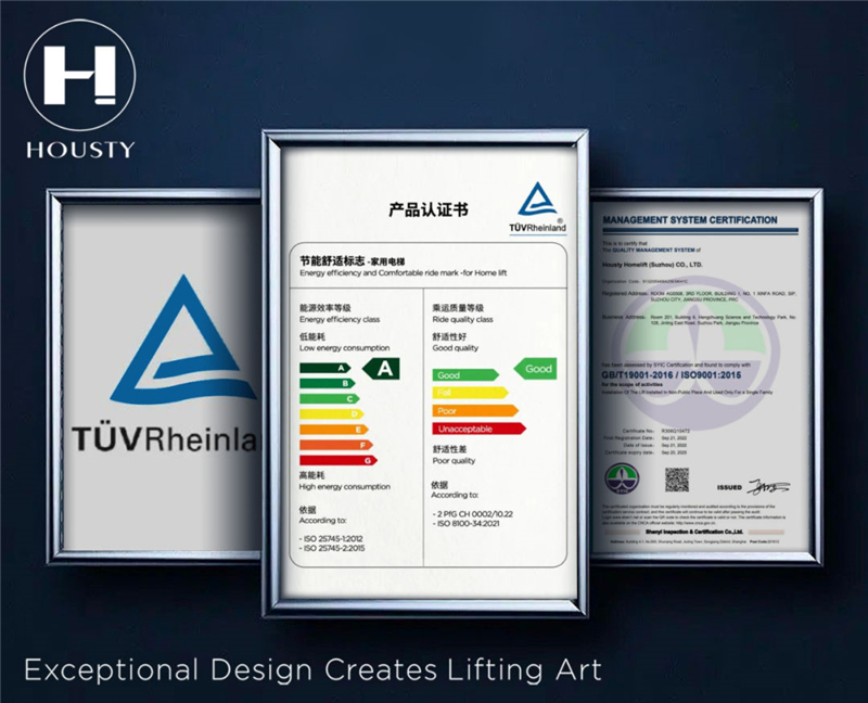 HOUSTY·亨世达家用电梯不断进行技术创新和产品创新,凭借原装进口螺杆驱动、专利抱闸系统、SSID智控系统等核心技术,以高标准通过荣获国际独立第三方检测、检验和认证机构德国莱茵TÜV集团的产品认证审核,在产品舒适度、静音性和节能环保等方面得到检验和认可。